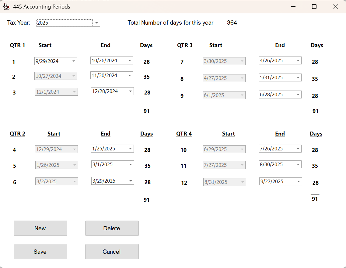 The heart of this module is a calendar that allows the user to enter the first and last day of each accounting period. For example, if the first day of the year was January 02 and the last day of the first accounting period was January 29, we would have a four (4) week period of 28 days. The 13 Period Accounting module is the same as the 4-4-5 Week Period Accounting except that the tax year will consist of 13, 28 day accounting periods.