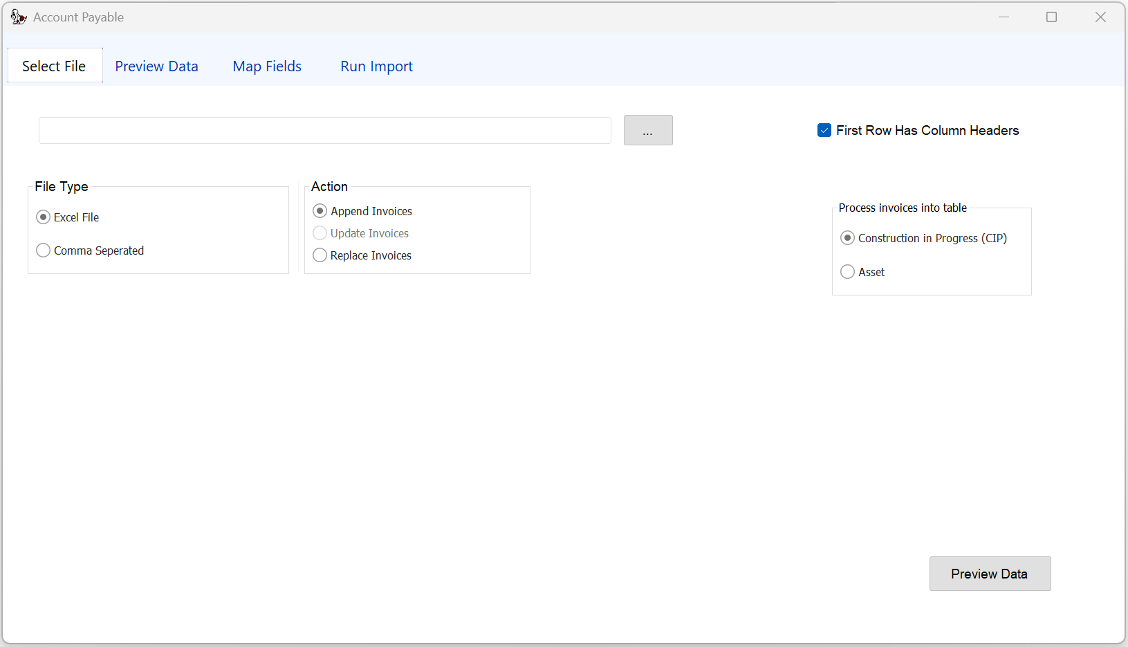 The Accounts Payable Import module allows the import of invoice detail to either the Bassets CIP module or directly to the asset table. When importing to CIP, each invoice creates one associated CIP record. These can later be consolidated into one or more asset records.